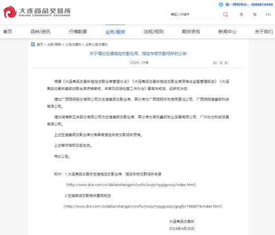 4月26日,大连商品交易所发布《关于增加生猪指定交割仓库、指定车板交割场所的公告》,湖南新五丰股份有限公司(以下简称“新五丰”)获批为生猪集团交割仓库,分库为新五丰子公司衡东鑫邦牧业发展有限公司、广州壮壮科技发展有限公司,并获得指定车板交割场所资格。