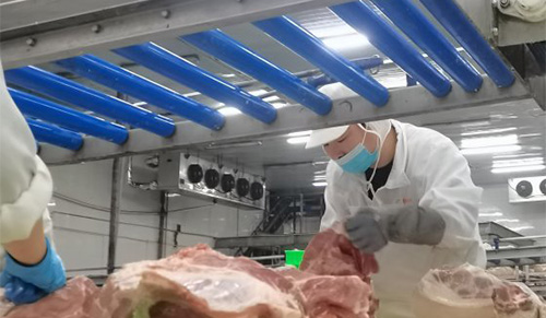 湖南省长株潭广联生猪交易市场的生产车间内,墙上的时钟已指向晚上10点,分割生产的流水线正有条不紊地运行着,只见工人们将白条猪分割为大大小小的鲜肉,并熟练地将肉品打包装箱。