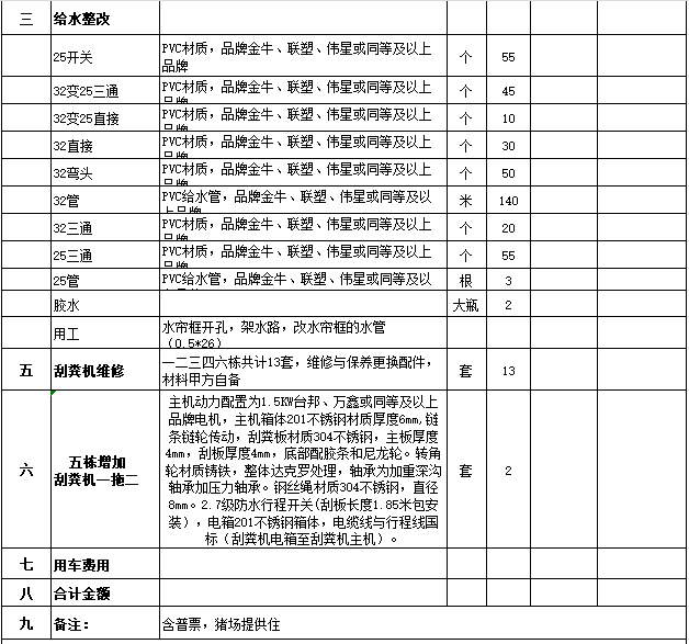 注:按包干总价,价格包含税费及乙方途中及隔离食宿,交通等费用(猪场施工期间提供住宿,餐费自负)。