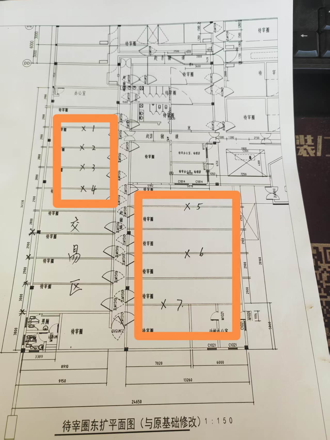 附注:1、拆除现有红色标记区域猪栏里的交易设施、钢制围栏、恢复标记1到7号猪栏中7面隔墙;2、将原来大猪栏间隔成小栏,每个猪栏配备水槽、饮水器,栏门;3、恢复猪栏现场部分拆低的栏墙,4、维修交易区和此次施工区域的喷淋系统。