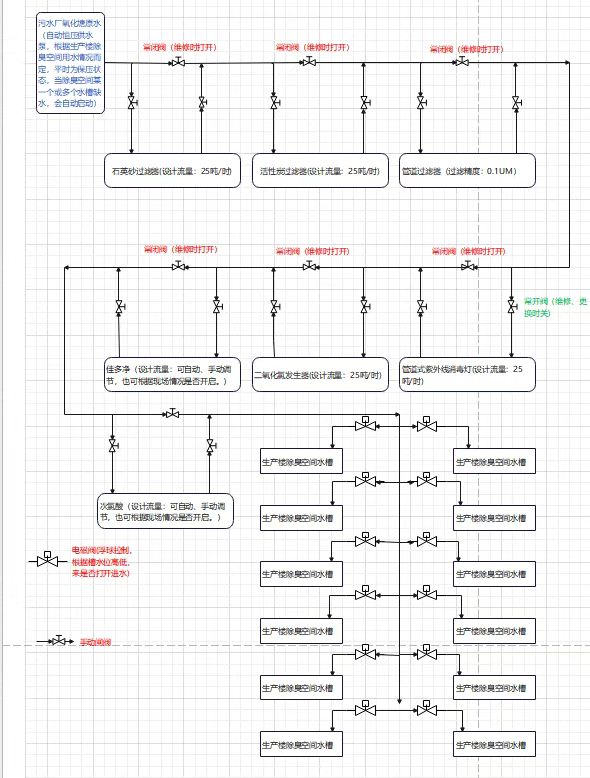2.增加一套尾水净化系统,将氧化塘内废水通过石英砂、活性炭以及管道过滤后,进行管道式紫外灯消毒、二氧化氯消毒和次氯酸消毒;