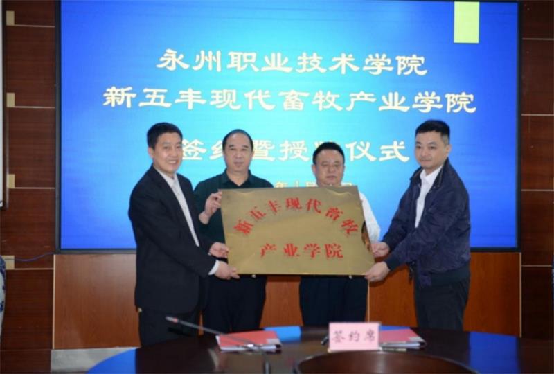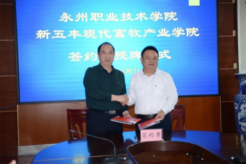 4月21日上午,由湖南新五丰股份有限公司(以下简称“新五丰”)与永州职业技术学院(以下简称“永州职院”)合作共建的“新五丰现代畜牧产业学院”签约揭牌仪式在永州职院举行。永州职业技术学院党委副书记、校长翟惠根,党委委员、副校长韩立路、窦铁生,新五丰党委副书记、副董事长、总经理刘艳书,党委委员、副总经理毛鸥,党委委员、副总经理、母猪事业部总经理李锦林等出席本次签约揭牌仪式。仪式由永州职院校党委委员、副校长韩立路主持。