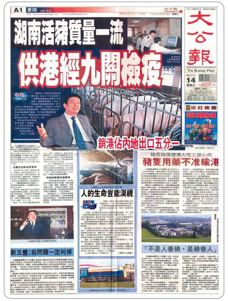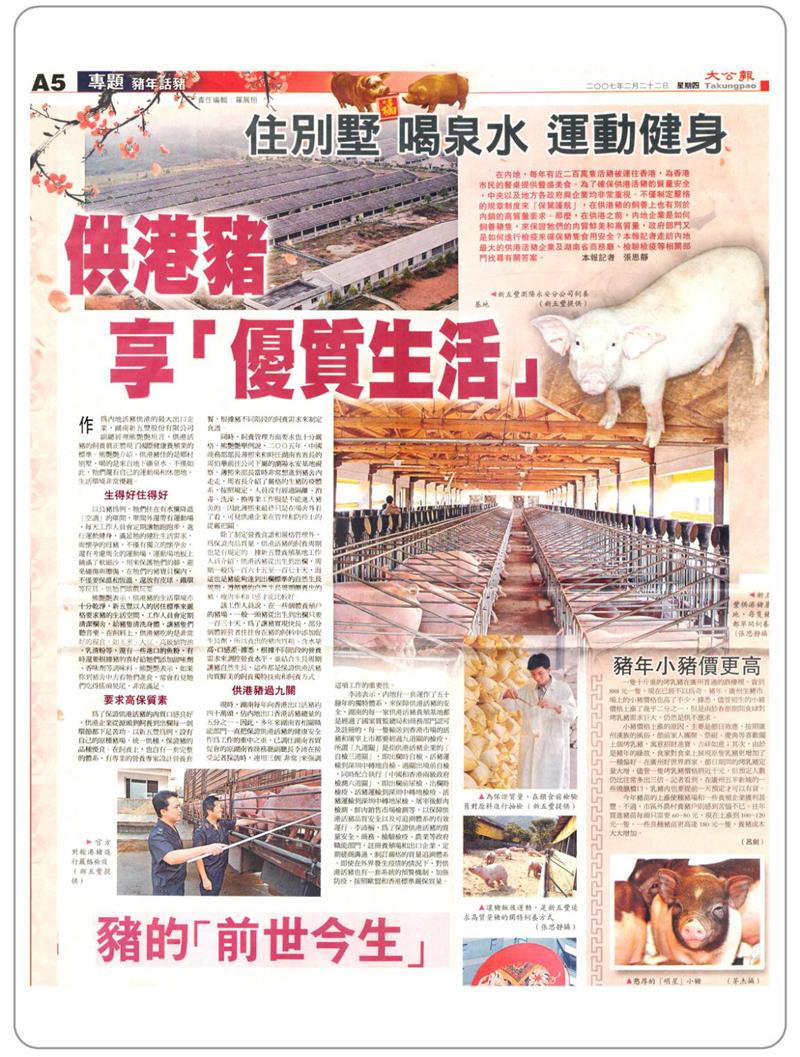 新五丰最开始供港澳市场的生猪出口配额每年稳定在40多万头,占有港澳市场的五分之一左右的市场份额,常年稳居内地口岸第一位。