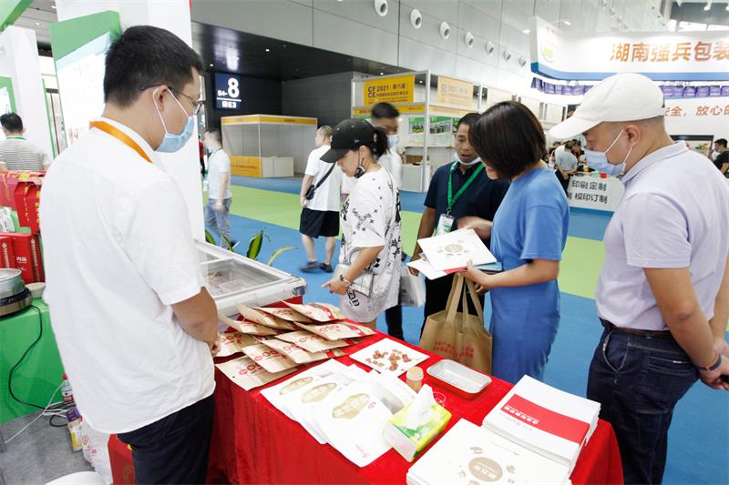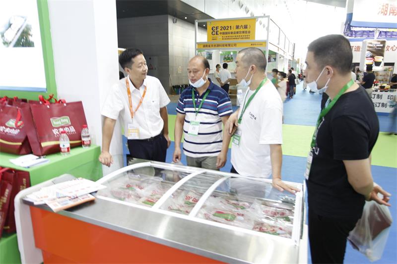 在开幕式前,湖南省人民政府副省长陈飞在相关领导和工作人员的陪同下,从北登录厅开始进行各展馆的巡馆。在省现代农业集团的展位停留之际,集团党委书记、董事长许维向陈飞一行就U鲜、农丰等品牌包装产品进行了详细介绍。