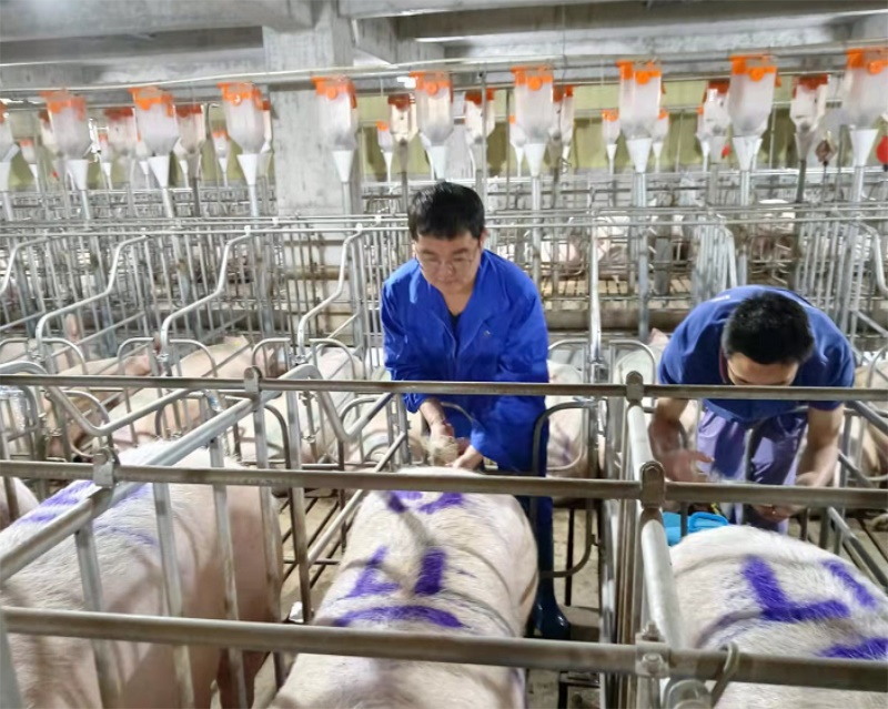 领导的眼光显然不会错,黄棚飞身上这股执拗劲儿自然是这项任务的不二人选。“每天下午开始,就会有猪车从育肥场陆续开到这边来,每辆大概有100多头母猪。”据场长武腾飞回忆,当时员工们每天都要负责这五、六趟猪车的猪群转运,而这都需要黄棚飞现场指导。面对一百多公斤重一只的母猪,就算他亲自率队赶猪进场,每天也要忙到下半夜。黄棚飞考虑到大家伙的精力有限,就将所有员工分为两班倒,而他自己每天忙活好了赶猪工作,还要在楼房里一层一层巡视、观察、记录转入母猪的情况,保障猪只的健康,场内场外一手抓的工作性质让他那段时间没睡过一个安稳觉。终于,在场长和他的带领下,这项艰巨的任务得以完美收官。黄棚飞仰望着这栋顺利投产的高耸楼房,顿时觉得充满了生气。