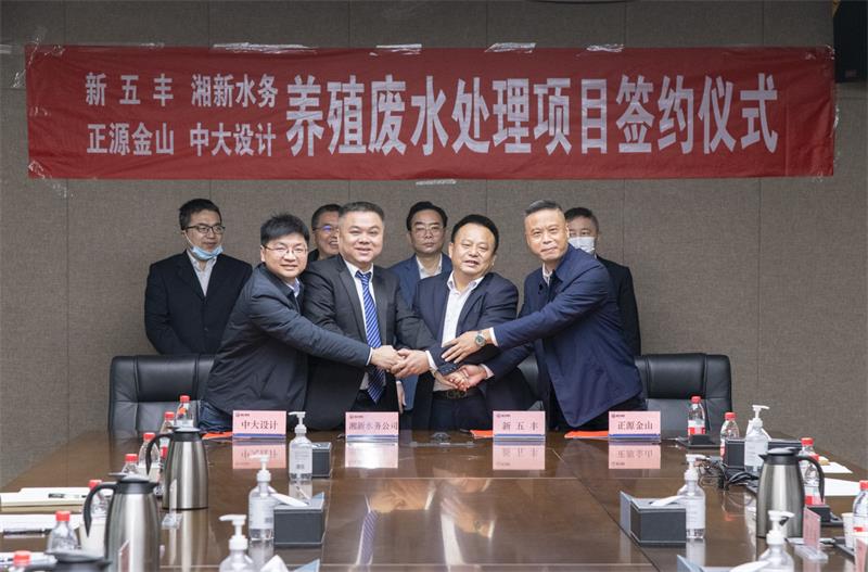 3月30日上午,湖南新五丰股份有限公司(以下简称“新五丰”)与湖南湘新水务环保投资建设有限公司(以下简称“湘新水务”)、湖南正源金山水务有限公司(以下简称“正源金山水务”)、湖南中大设计院有限公司(以下简称“中大设计院”)在湖南湘江新区发展集团有限公司(以下简称“湘江集团”)23楼会议室举行《养殖废水处理及资源化利用项目合作协议》签约仪式。
