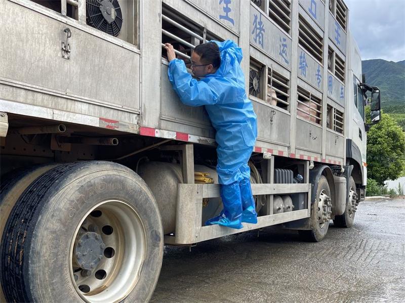 我双脚踩着生猪运输车的侧边防撞栏,趴在车身上仔细观察着车厢内数百只活猪发运前的状况,在防护服的“加持”下,汗水早已浸湿了我打底的衬衫。