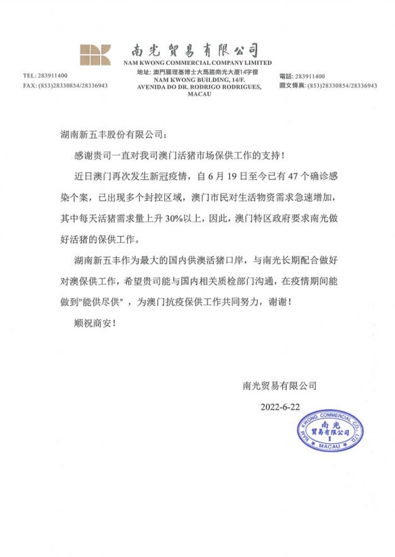 时间来到6月,澳门新一轮疫情发生后,新五丰作为保供企业立即与澳门代理行进行沟通,调整了出口计划和出口车次。而当我接到每日要向澳门供应三车次105头活大猪这项紧急任务时,便第一时间组织养殖场加大出栏量,并衔接产地检验报检后,运输到斗门定点的供澳活大猪过驳站过驳到粤澳两地牌车辆,再到海关现场查验报关出口,多重检验和监管,确保供澳活大猪及时通关。而后,出口团队的决断如流也让南光贸易有限公司特地发来函件,赞扬和鼓励新五丰积极的应对措施。
