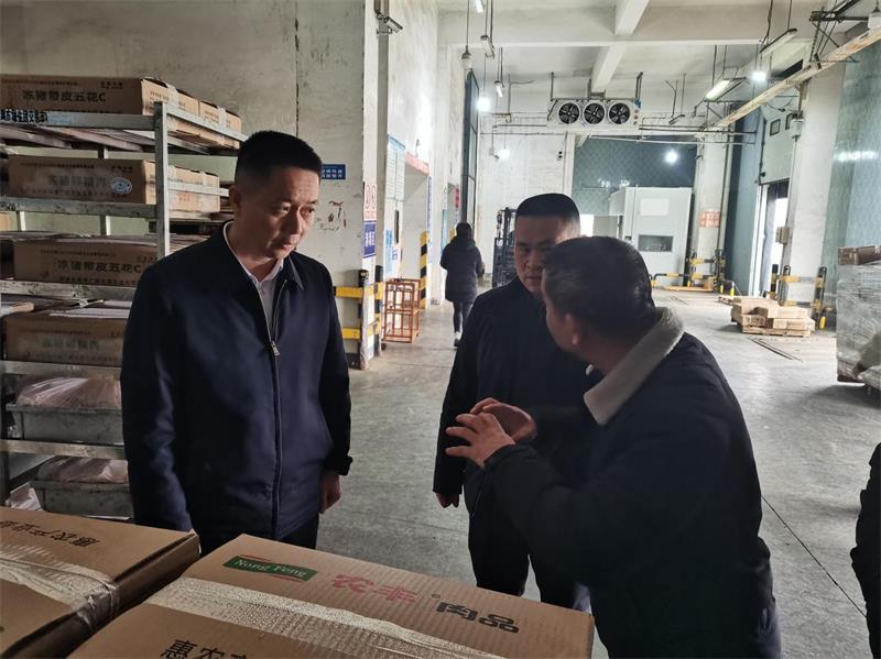 石争到广联公司后,在工作人员的陪同下先后查看了生猪待宰圈、生产车间、冷库和市场,在交流中了解近期屠宰、节后开工、市场保供等情况,以及企业在生产经营中遇到的困难和问题。广联公司总经理吴宏飞分别就公司生产经营、安全生产、疫情防控和稳产保供等方面的情况进行了汇报说明。