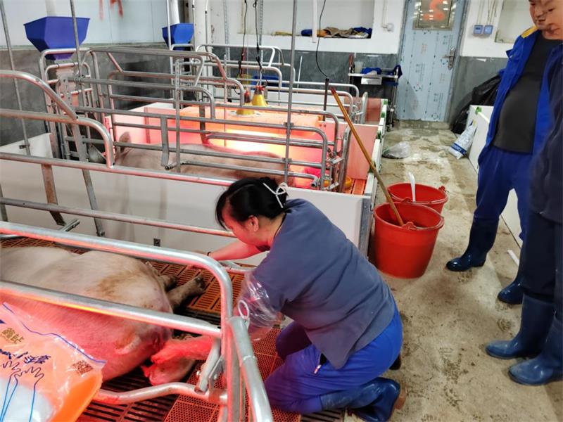 一日,猪场内部会议开到较晚,散会后刘爱华并未选择偷懒,依旧按照惯例进行巡栏。过程中,另一边的产房人员跑过来告知她有母猪难产的情况,请她过去查看。刘爱华赶往栏舍,见到呼吸急促的母猪侧卧着,便将双手放在母猪胸前,依次由前向后均匀用力按摩母猪下腹部乳房区,直至母猪出现努责的现象,她又变换助产姿势,有节奏、有力度地向下按压腹部逐渐变化的最高点,最后将仔猪成功排出体外。一气呵成的操作引来一旁年轻饲养员赞许的声音。“这不就下崽了嘛”。作为征战养殖一线的“老将”,刘爱华显然对这样的场面得心应手。