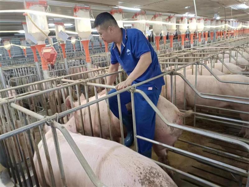 前年7月,王盼超从老家河南远赴宁乡亥土母猪场负责一期配怀工作。当时这里的环境条件并不比其它猪场要好,栏舍通风降温条件较差,加上天气炎热,同时受封闭工作环境的困扰,一时间猪场人心不稳,队伍士气正处于低谷,而刚入职的王盼超则成了鼓舞士气的引路人。他积极发挥河南人敢闯敢拼的精神,始终用饱满的热情完成场长交待的各项任务。面对栏舍降温条件较差的情况,他很快与几位资深的同事分析出是由于水帘缺乏增压泵导致。“通过观察,我发现水帘时而有漏水的情况。”为了应对客观条件给生产工作带来的不便,王盼超的办法是加强对两个区的巡栏,将水泵间歇性关停,等冷却之后再打开,防止水帘烧坏的同时,又能达到给猪只降温的效果。王盼超用实际行动为同事树好榜样,也经常以开朗的性格和大家开着玩笑,激励大家多想办法,多克服多奉献,让大家看到他虽同为养殖人员,却散发的独特人格魅力,逐渐从负面的情绪中摆脱了低迷,重新以饱满的姿态投入到工作中。