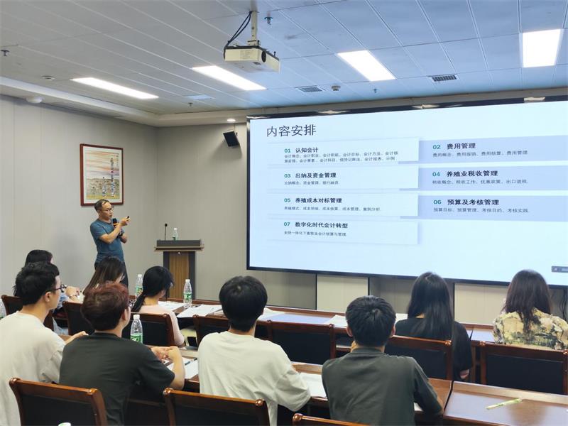 岗前培训由周飞巨给同学们进行《岗位生产安全》和《猪场生物安全》的培训;四门企业课程分别由新五丰生产技术中心品控工程师浣伟平授课的《饲料加工与检测技术》,舜新公司总经理葛汉根授课的《全面质量管理学》和《生猪屠宰加工及肉品品质检验》,新五丰财务总监肖立新授课的《数字化时代生猪养殖会计核算与管理》,新五丰党委委员、副总经理周庆华授课的《畜禽养殖场规划与设计》。本次由公司高管和内部员工担任授课老师的全新模式是公司与学校共同商定的新五丰现代畜牧产业学院畜牧兽医专业人才培养方案中的要求,更是一次人才培养模式的创新与探索。