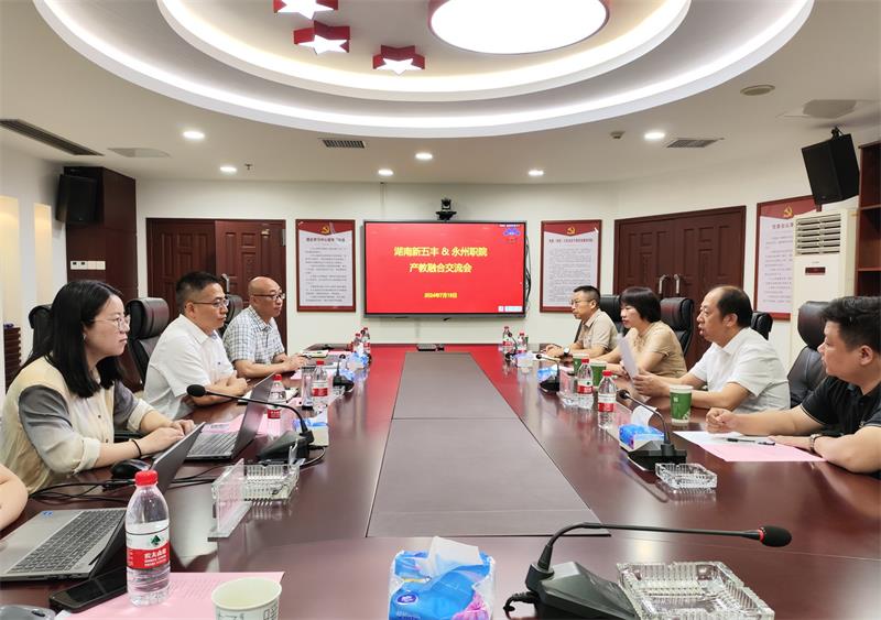 7月18日,永州职业技术学院(以下简称“永州职院”)党委委员、纪委书记宾柱元一行到湖南新五丰股份有限公司(以下简称“新五丰”)开展产教融合交流座谈,新五丰党委副书记、职工董事刘海生,党委委员、副总经理周庆华参加会议。