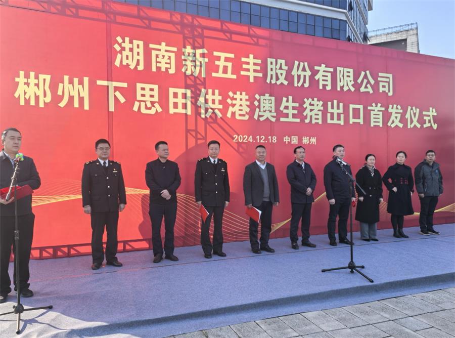 12月18日上午,湖南新五丰股份有限公司(以下简称“新五丰”)郴州下思田供港澳生猪出口首发仪式在郴州市苏仙区举行。郴州市人民政府副秘书长黄卿,郴州市商务局局长黄琴,郴州海关关长陈义双,苏仙区委副书记、代理区长禹谦和,新五丰党委副书记、副董事长、总经理朱永胜等参加仪式。