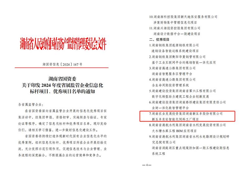 12月18日,省国资委发布2024年度省属监管企业信息化标杆项目、优秀项目名单,湖南农业集团所属“新五丰东安智能化饲料工厂项目”经过严格的评选审查,荣耀上榜。