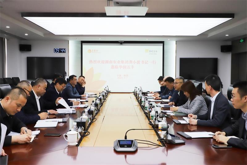 4月7日,湖南农业集团党委书记、董事长龚小波一行赴华润五丰有限公司(以下简称“华润五丰”)开展合作洽谈,华润五丰党委书记、董事长原强,党委委员、副总经理许宗煜,集团党委委员、副总经理龚自冶参加座谈会。