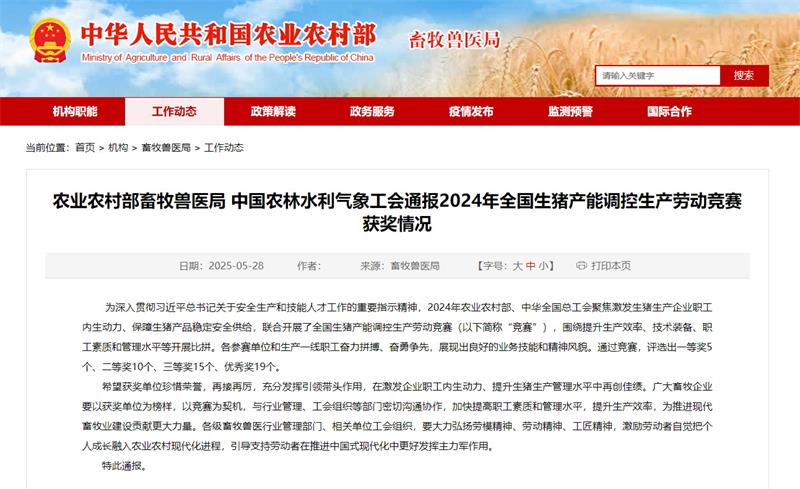 为深入贯彻习近平总书记关于安全生产和技能人才工作的重要指示精神,农业农村部、中华全国总工会聚焦激发生猪生产企业职工内生动力、保障生猪产品稳定安全供给,联合开展了全国生猪产能调控生产劳动竞赛。其中,新五丰所属衡南晟峰母猪场、临澧天心种业有限公司凭借在生产效率、技术装备、职工素质和管理水平等方面的领先优势,分别斩获全国二等奖和全国三等奖。