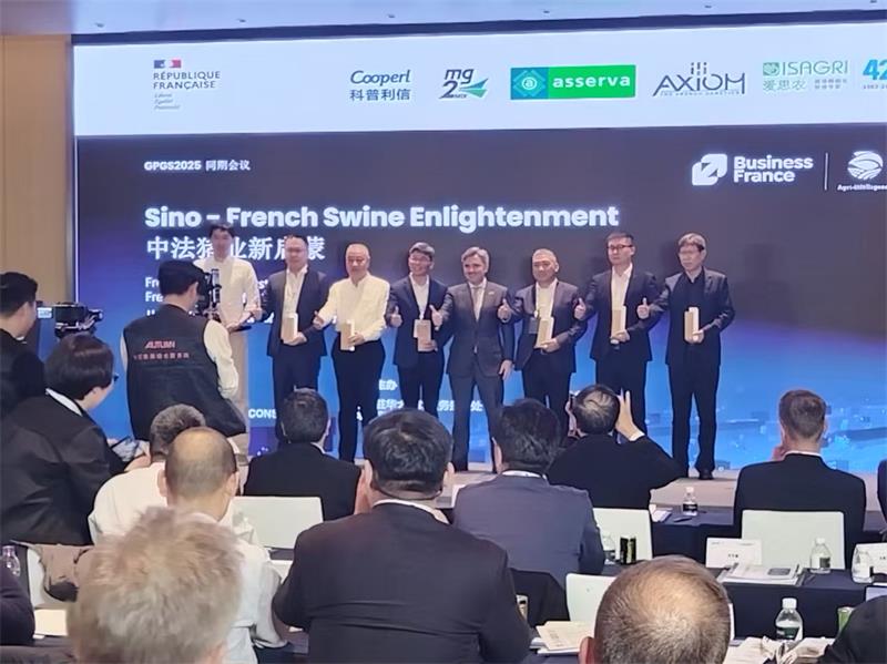 与此同时,经法国畜牧行业及法国驻华大使馆推荐,新五丰荣获“中法畜牧业合作杰出贡献奖”。现场,法国驻上海总领事馆总领事王度、法国驻华大使馆经济处农业参赞罗百灵、法国驻上海总领事馆商务参赞沙伟共同为获奖企业颁奖。这一荣誉不仅体现了国际社会对中国生猪产业转型升级成果的认可,也彰显了新五丰在推动中法生猪技术交流与可持续养殖实践中所发挥的桥梁作用。未来,新五丰将持续深化国际合作,融合法系先进育种理念与数字化管理经验,提升育种创新水平与养殖生产效率,助力中国猪业实现高质量发展。