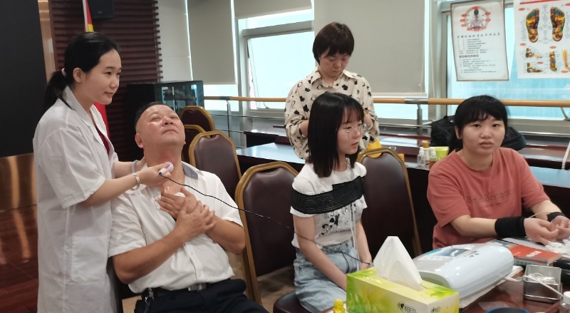 活动中,来自中医针灸理疗康复研究院的魏医生耐心细致地询问干部职工的身体特征、生活习惯等情况,通过测血压、测经络,中医把脉,检测血液粘稠度等方式认真检查职工身体情况,对症诊治。结合上班族人群的特点,魏医生从椎体关节病症、血液类代谢异常疾病、九大体质易出现的问题以及妇科等慢性疾病进行讲解和答疑,针对不同症状的职工群体现场进行了无痛针灸、拔罐、刮痧、激光、足底反射疗法、水底反射疗法以及热疗等理疗服务。在与职工的交流当中,魏医生还不忘普及宣传中医药知识,教会大家在日常生活中通过调节饮食、作息等习惯改善健康状况。