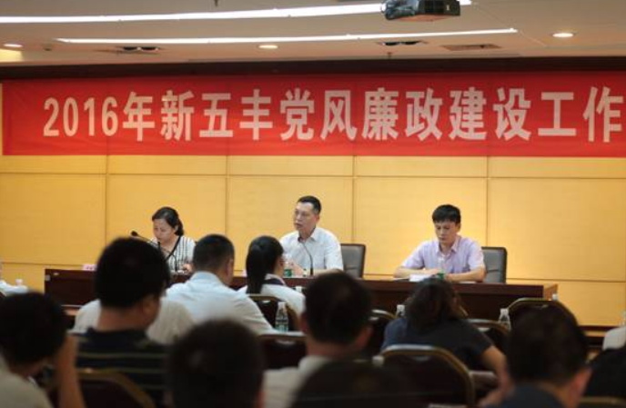 下午两点,刚刚进行过警示教育的党员领导同志们在公司19楼多功能厅出席了党风廉政建设专题部署会。会上,党总支副书记罗雁飞同志有感于上午的学习教育,和大家分享了体会;党总支专职副书记纪检委员何万兵同志汇报新五丰党总支2015年度-2016年上半年党风廉政建设工作开展的具体情况,以及下一步的党风廉政建设工作安排;随后,党总支书记何军同志对新五丰整体的党风廉政建设工作提出要求,对每一位党员、领导、干部指出,虽然工作和生活中的诱惑不如警示案例中贪腐官员们面临的多,但仍然需要应时刻自觉按照党员标准规范言行,以“严肃责任、严守纪律、严抓作风、严查问题、严抓监督” 来鞭策我们“勿以恶小而为之”,做到警钟长鸣。要进一步坚定理想信念,提高党性修养;进一步增强政治意识、大局意识、核心意识、看齐意识,廉洁修身,强信念、重操守、雅情趣、慎交友;进一步筑牢拒腐防变的防线,廉洁齐家,管好子女家人、亲戚朋友和身边下属。以古人先哲的忠孝廉节修养自己,以革命先辈的廉洁风范激励自己,以贪腐人员的前车之鉴警醒自己,真正做到真学真做、敬法畏法,遵规守矩,做一名合格的党员。