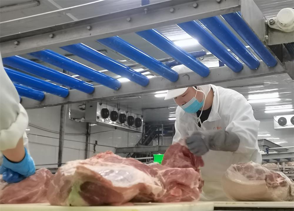 湖南省长株潭广联生猪交易市场的生产车间内,墙上的时钟已指向晚上10点,分割生产的流水线正有条不紊地运行着,只见工人们将白条猪分割为大大小小的鲜肉,并熟练地将肉品打包装箱。朦胧的夜色下,分割车间成为安静祥和的毛塘工业园里为数不多还亮着灯的风景,而对于分割技工任微来说,这不过是入职广联以来的两千多天中平凡的一个夜晚。
