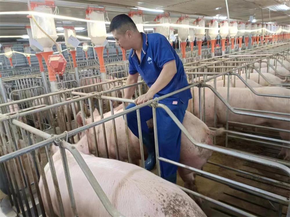 前年7月,王盼超从老家河南远赴宁乡亥土母猪场负责一期配怀工作。当时这里的环境条件并不比其它猪场要好,栏舍通风降温条件较差,加上天气炎热,同时受封闭工作环境的困扰,一时间猪场人心不稳,队伍士气正处于低谷,而刚入职的王盼超则成了鼓舞士气的引路人。他积极发挥河南人敢闯敢拼的精神,始终用饱满的热情完成场长交待的各项任务。面对栏舍降温条件较差的情况,他很快与几位资深的同事分析出是由于水帘缺乏增压泵导致。“通过观察,我发现水帘时而有漏水的情况。”为了应对客观条件给生产工作带来的不便,王盼超的办法是加强对两个区的巡栏,将水泵间歇性关停,等冷却之后再打开,防止水帘烧坏的同时,又能达到给猪只降温的效果。王盼超用实际行动为同事树好榜样,也经常以开朗的性格和大家开着玩笑,激励大家多想办法,多克服多奉献,让大家看到他虽同为养殖人员,却散发的独特人格魅力,逐渐从负面的情绪中摆脱了低迷,重新以饱满的姿态投入到工作中。