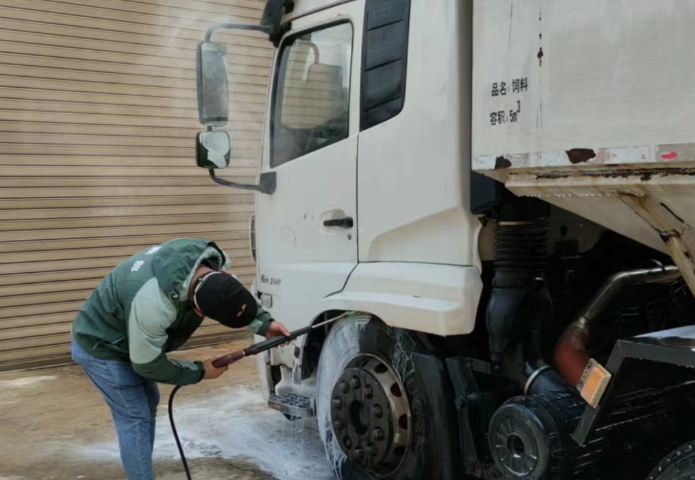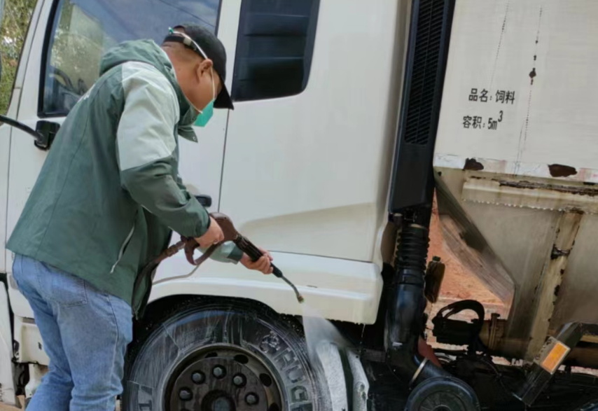 11月的低温气候和全国范围内频频异动的非洲猪瘟形成了鲜明对比。欧阳大维正在洗消点对着今天入场的第三辆饲料车进行清洗。“做好外围工作的关键并不是细致入微,而是极致入微”。欧阳大维介绍道。用水冲刷过车辆全身以后,再用高压清洗机将大量泡沫喷洒在车身的各个角落,待泡沫附着一段时间后,再用水枪进行清洗、晒干,这样的动作需重复2次,1次要花上40至50分钟,且每一个步骤都不能省略。尽管早已习以为常,但呼啸而过的寒风还是使得大口喘气的欧阳大维稍不留意就把空气里弥漫的刺鼻药水吸进嘴里,手也冻得发紫,即便如此,他依旧不敢有任何懈怠。
