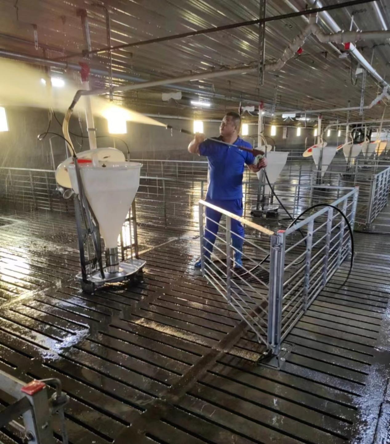 一年春作首,万事行为先。每当有猪舍清栏,谭明峰一定要亲自到清栏的育肥场进行指导,对于栏舍的消杀工作他颇有一番自己的心得。喷洒消毒液时,他要求饲养员按照从上到下、从里到外的原则,使用高压冲洗机先从屋顶、屋梁钢架开始,到墙壁,最后到地面,力求仔细、干净,不留死角,这样才能对猪舍内残留的粪便、垫料、灰尘做到彻底清洗。“任何细节的疏忽都可能给非洲猪瘟病毒提供滋生和传播的条件”。他与场长及饲养员一再强调着这份责任。他深知“欲筑室者,先治其基”的道理,在即将进猪之际,他总是要仔细检查每一处设备、墙角、进风口和地面才肯放心。